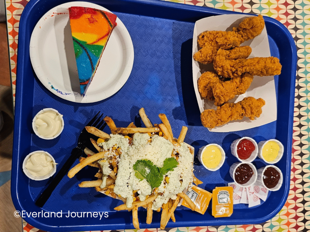 The food court has themed areas that match the resort room areas, and that theming is done well. This food court was louder and we liked the food better at Pop Century. However, we tried a couple of the specialty cupcakes and they were superb!