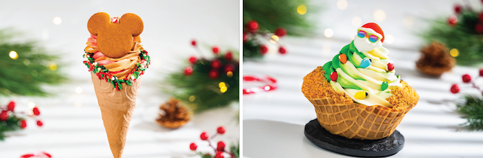 - Mickey Gingerbread Cone: Gingerbread cone with chocolate soft-serve, DOLE Whip pomegranate, holiday sprinkles, and gingerbread Mickey (New)