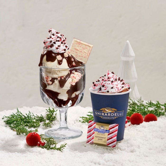 - Peppermint Bark Hot Fudge Sundae: Vanilla ice cream layered with handmade hot fudge and peppermint chunks topped with whipped cream, festive red sugar, mini dark chocolate chips, and a Peppermint Bark SQUARE
